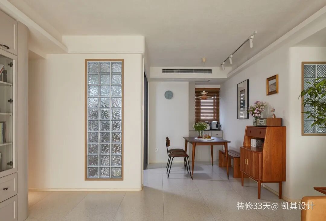 ▲ 客厅望向餐厅视角,两处选择玻璃砖墙取代实墙的设计,提升空间颜值的同时让光线更加流通