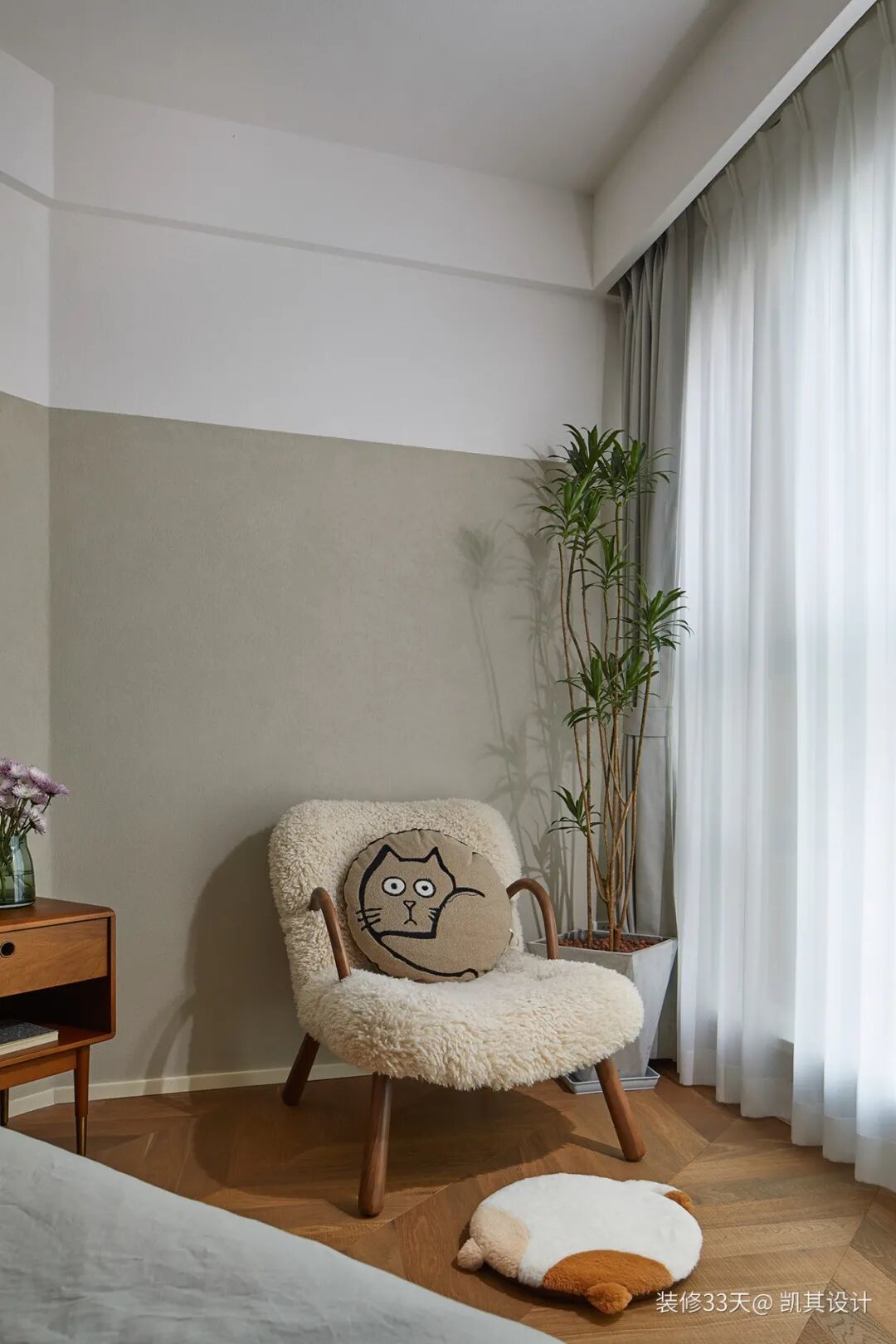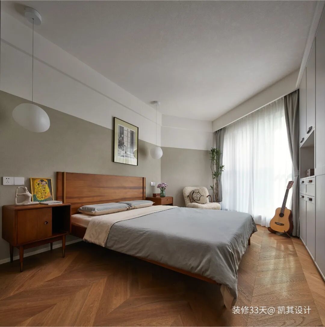 ▲ 主卧,鱼骨拼木地板,提升舒适度,分色墙面,强调简单结构与舒适功能的完美结合