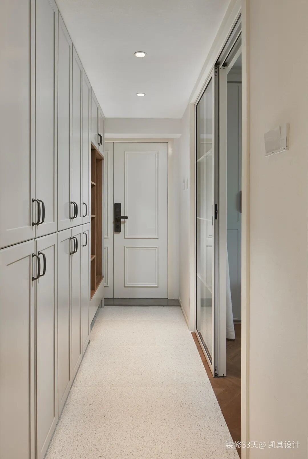 ▲ 玄关,右侧打造整墙白色鞋柜,与整体风格色调相得益彰,流露出洁净的清爽感,左侧选择玻璃移门增加采光,扩大空间感